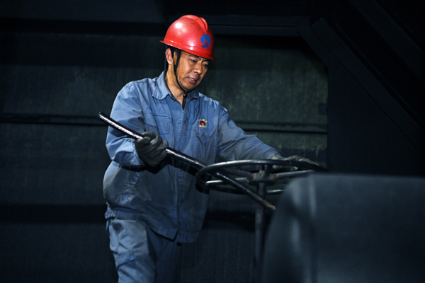 圖2:原煤卸完后,班長黃平均用撬棍擰緊鐵盤關閉車門。