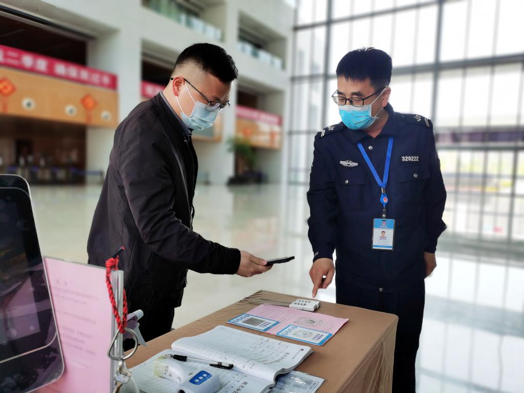 10:15,辦公中心大廳安保人員劉志強檢查進入大樓人員行程碼。他說,要守住進入大樓的“最后一關”,保證秩序平穩、衛生安全。
