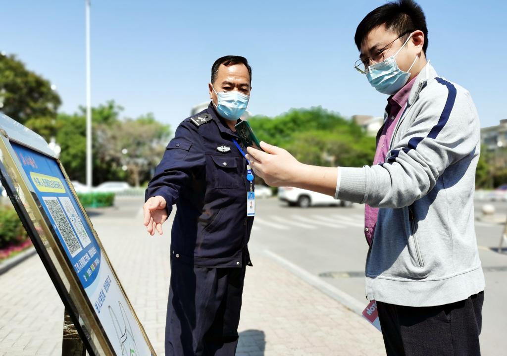 5月2日上午10:10,辦公中心西門崗值班職工孫正國(左一)在對訪客做疫情防控“雙碼”檢查。他表示,“五一”期間也要嚴格把好“入口關”,堅決保證疫情防控安全。