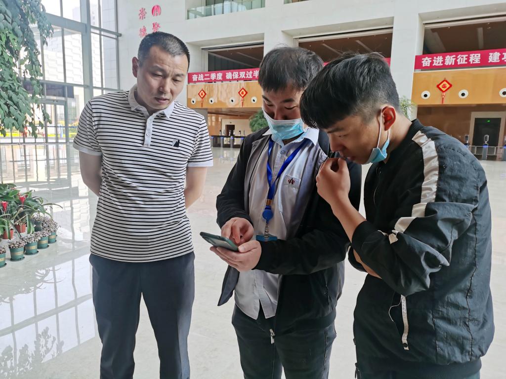 10:20,行政事務服務公司經理張亮(中)聯系運維公司專業技術人員,及時解決機關人員過閘機時安康碼不能識別問題。