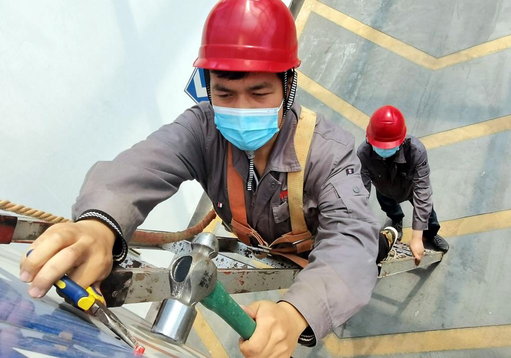 10:50,淮北礦業集團“首席高徒”、物業分公司機電運營公司職工李冠磊在和工友高少浩處理辦公中心東側地下車庫損壞的限高牌。作為機電維修值班,他們要確保“五一”期間大樓各項機電設施運行完好。