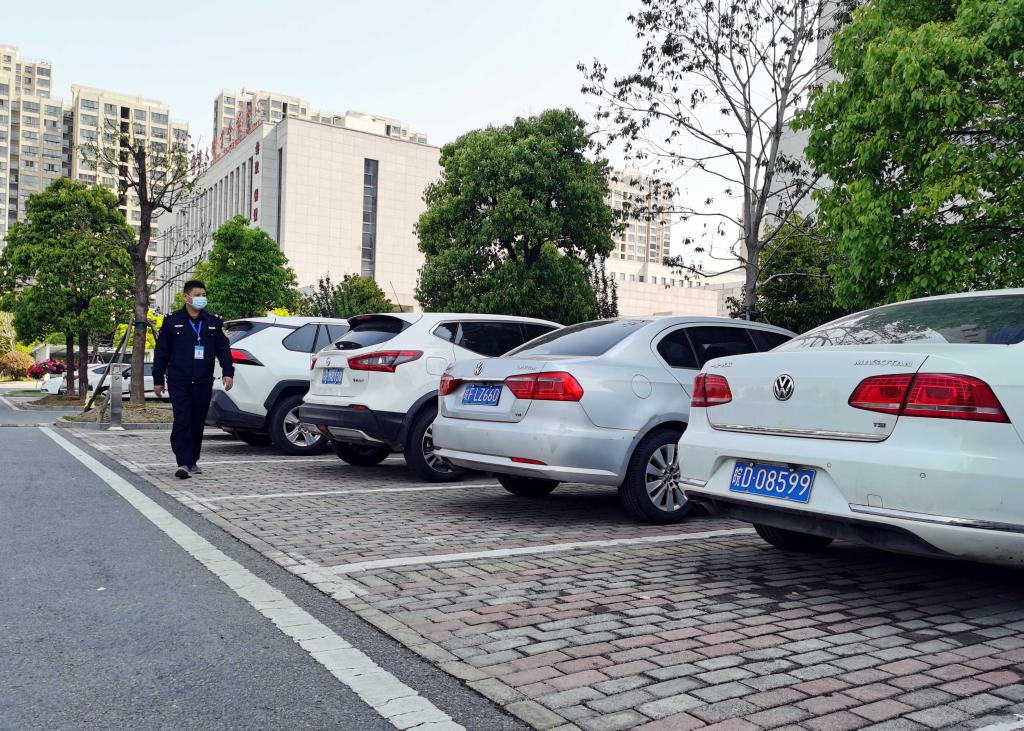 10:12,行政事務服務公司職工王銀雙在車場巡查,當天,他要負責對辦公中心院內和大樓各個區域安保、消防情況進行全天候走動巡查,及時處置突發性事件。